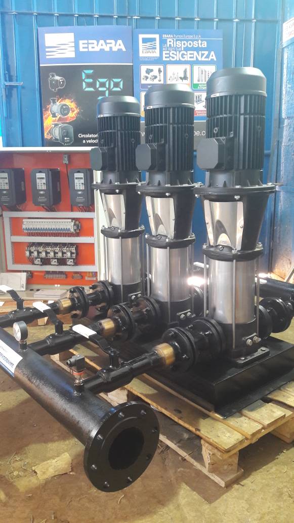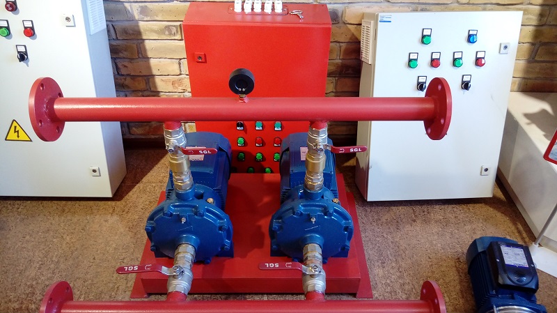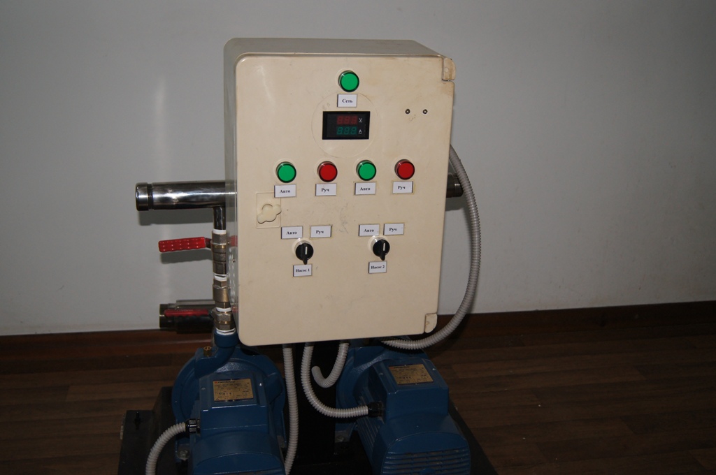 Насосная станция состоит из двух насосов. Работой насосами управляют частотные преобразователи, которые изменением частоты вращения двигателей насосов задает требуемое давление. В результате совместная работа 2-х насосов, обеспечивает работу станции в диапазоне от 2 до 10 Бар, таким образом, давление в точке потребления не меняется от количества конечных пользователе.
